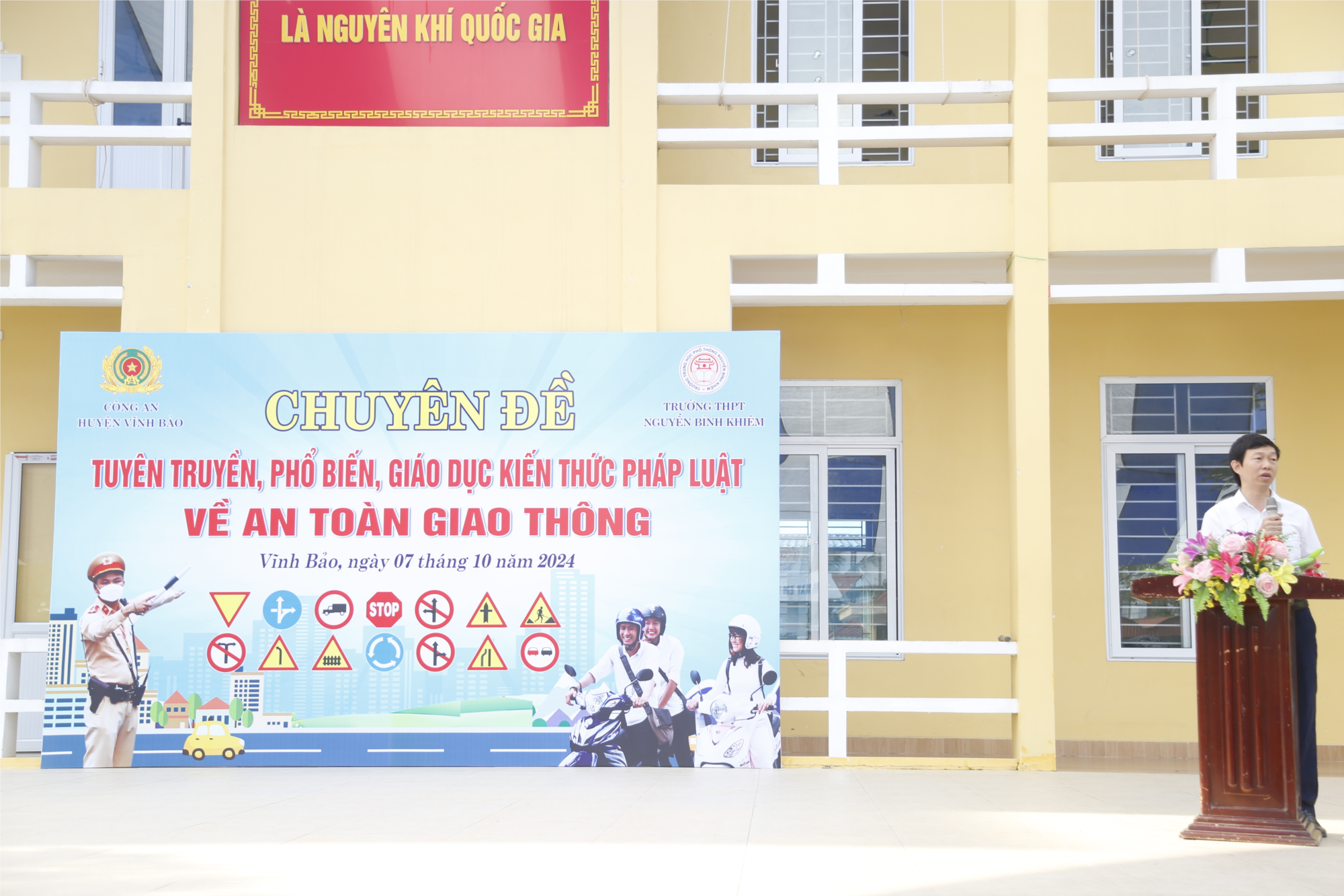 Sáng ngày 7/10/2024 trường THPT Nguyễn Bỉnh Khiêm tổ chức lễ chào cờ đầu tháng 10/2024. Về dự buổi lễ có thầy Tống Công Thương, Bí thư đảng bộ - Hiệu trưởng nhà trường, các đồng chí công an huyện Vĩnh Bảo, cùng các thầy cô giáo và 1500 học sinh của trường THPT Nguyễn Bỉnh Khiêm.