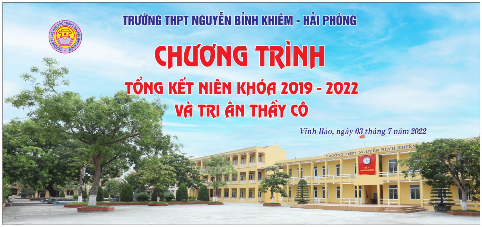Chiều ngày 3/7/2022 trong không khí trang trọng vui tươi và ấm áp, trường THPT Nguyễn Bỉnh Khiêm long trọng tổ chức thành công chương trình Tổng kết niên khoá 2019 – 2022 cùng Lễ Tri ân và trưởng thành cho học sinh khối 12. Đến dự chương trình Tổng kết có sự hiện diện của Ban đại diện Hội Cha mẹ học sinh nhà trường, cán bộ, giáo viên, nhân viên và học sinh khối 12.