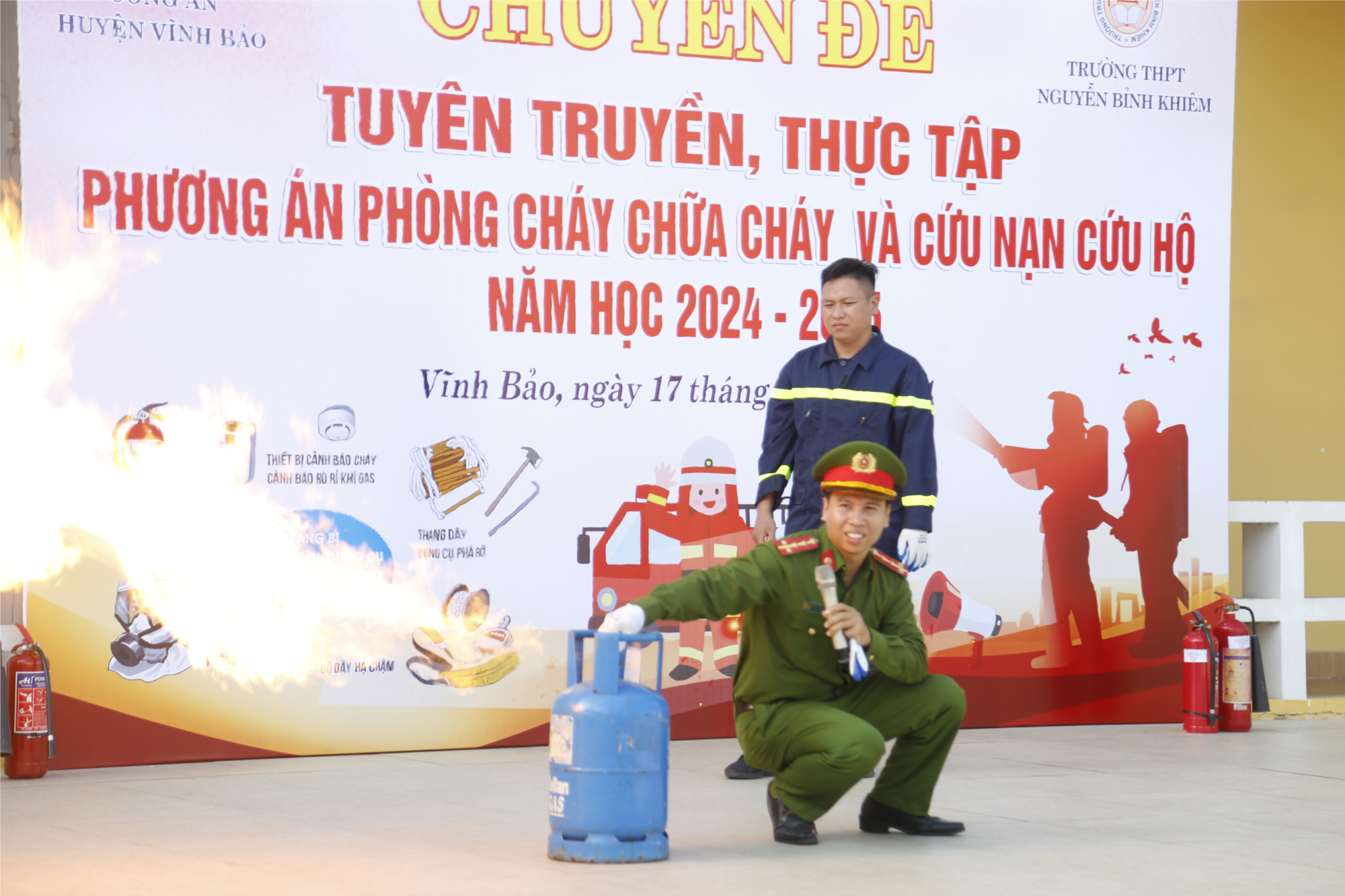 Tại buổi tuyên truyền đại úy Nguyễn Văn Thuân - “Chú lính cứu hỏa”- cán bộ của đội PCCC huyện Vĩnh Bảo đã có những chia sẻ, phổ biến kiến thức cơ bản về PCCC và các biện pháp bảo đảm an toàn PCCC; kỹ năng xử lý, thoát hiểm khi có cháy xảy ra; thực hành trải nghiệm một số phương tiện, trang thiết bị phục vụ công tác chữa cháy; kỹ thuật di chuyển, tự thoát nạn trong môi trường khói, khí độc và các biện pháp di chuyển người bị nạn; xử lý đám cháy từ bình ga, xăng dầu và các vật liệu khác bằng bình khí, bình xịt, kỹ năng sơ cấp cứu người bị nạn. Ngoài ra các bạn học sinh và thầy cô còn được tham gia tình huống giả định đầy thú vị, qua đó nâng cao kĩ năng cứu nạn cứu hộ, xử lí tình huống khi có cháy nổ cho bản thân mình.