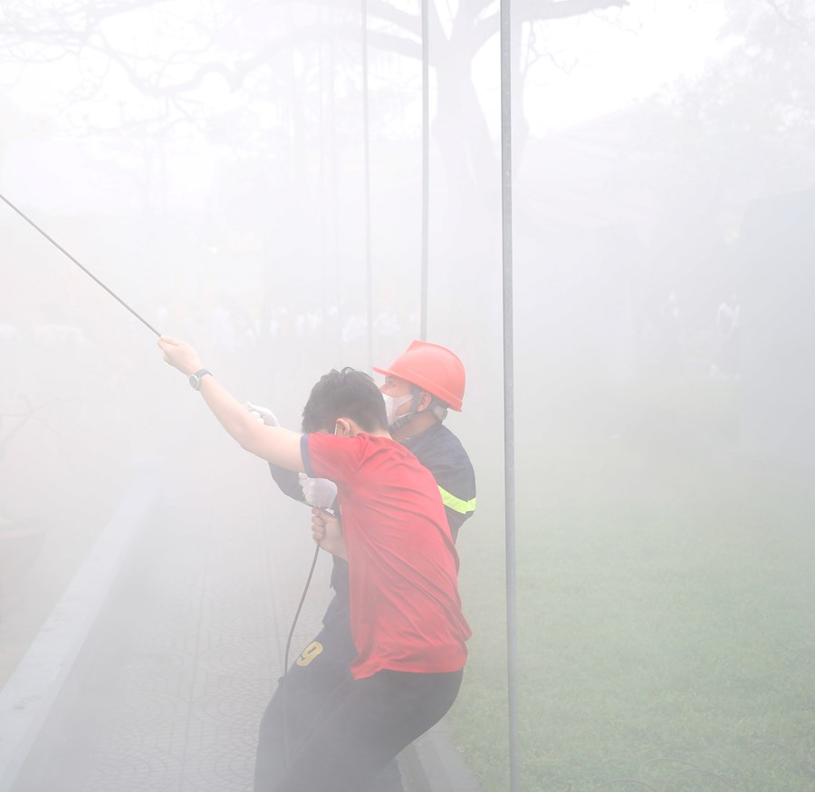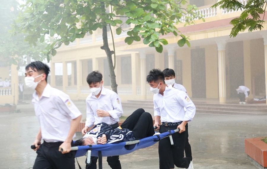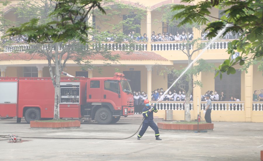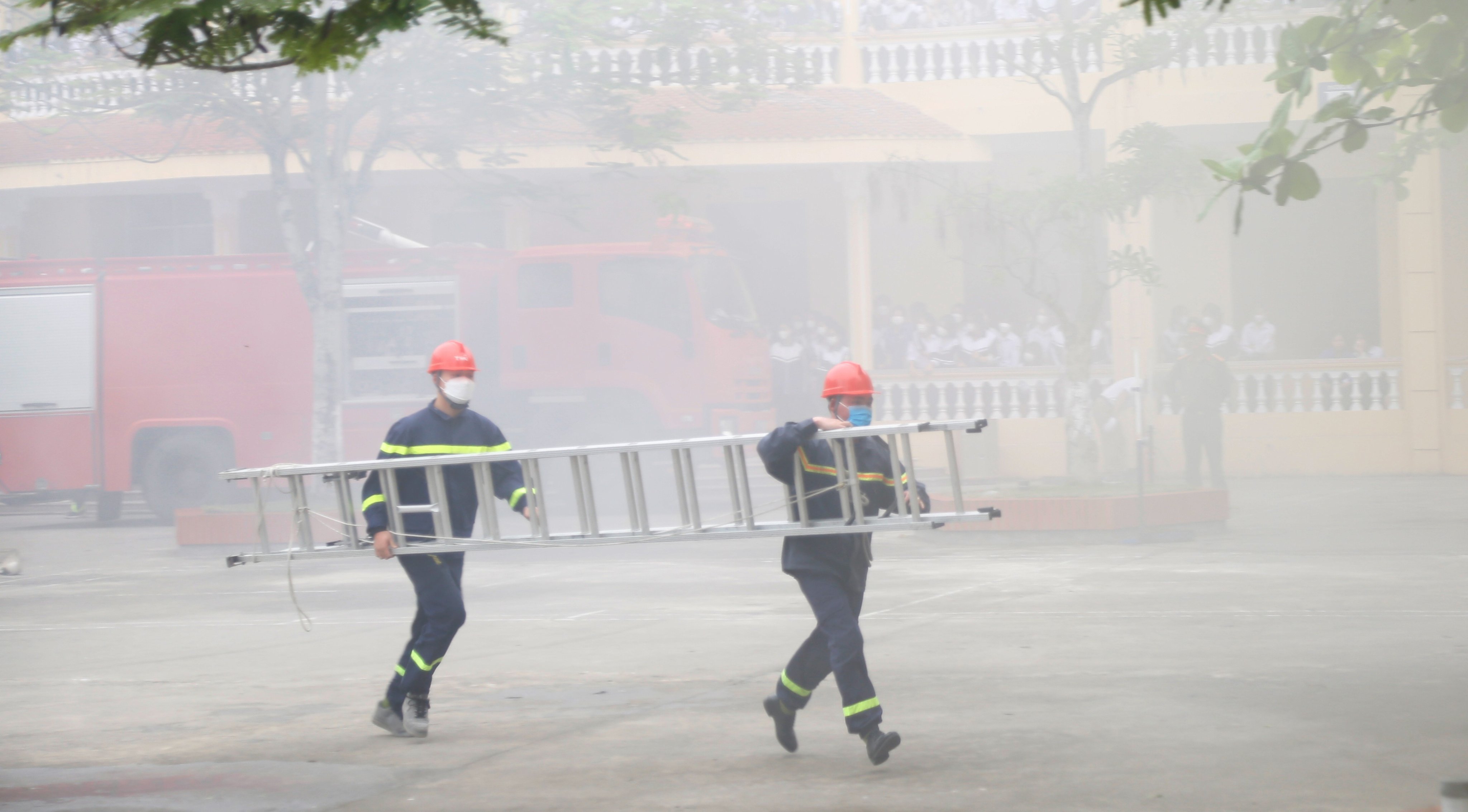 Bên cạnh tiếp thu kiến thức từ lý thuyết, cán bộ, giáo viên và học sinh trường THPT Nguyễn Bỉnh Khiêm còn tham gia diễn tập phòng cháy chữa cháy với tình huống giả định trường xảy ra đám cháy tại khu nhà D và C. Trong buổi diễn tập, giáo viên và học sinh nhà trường đã thực hiện hướng dẫn thoát nạn và di chuyển tài sản đến nơi an toàn trong trường hợp có cháy xảy ra.