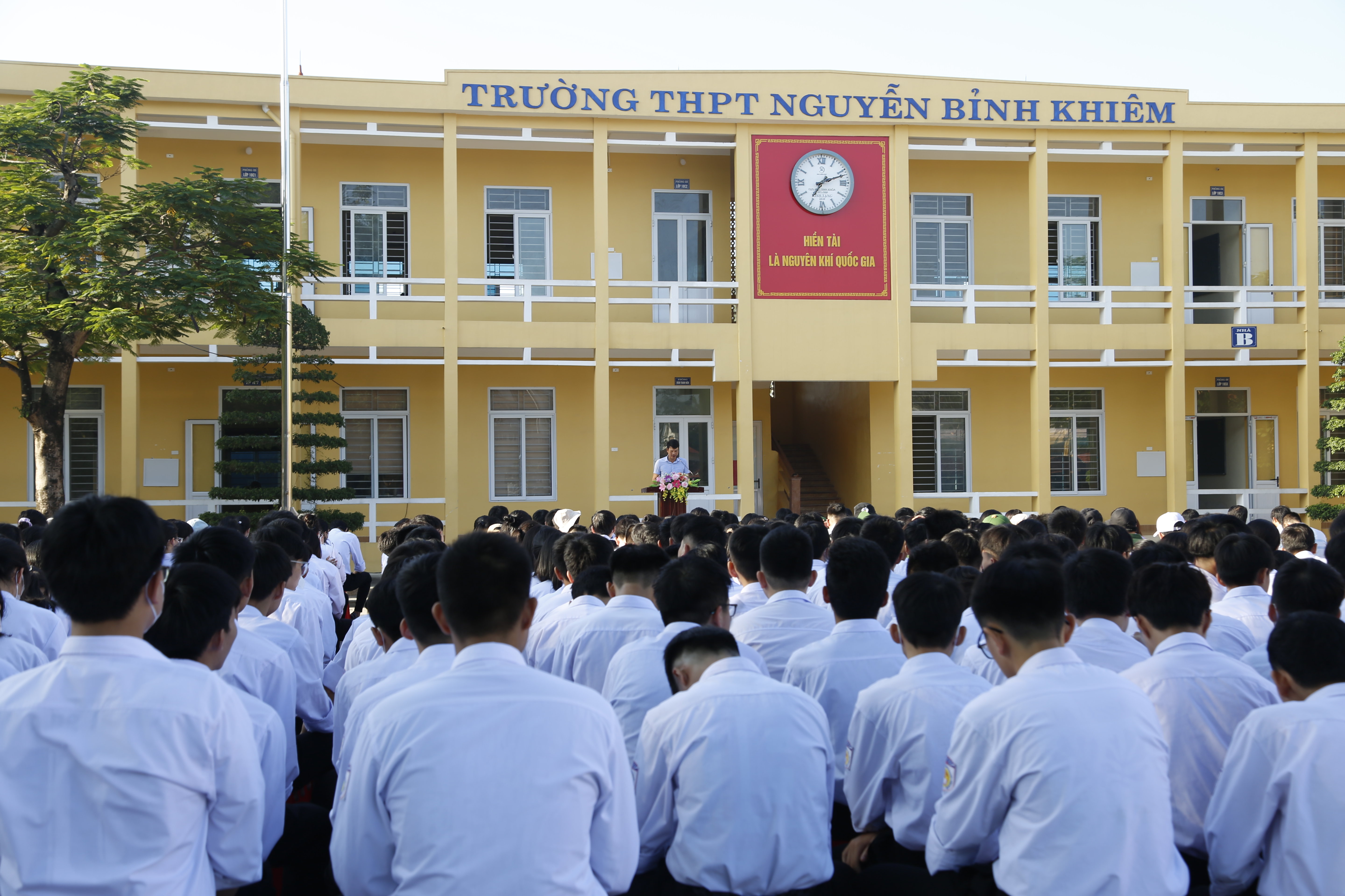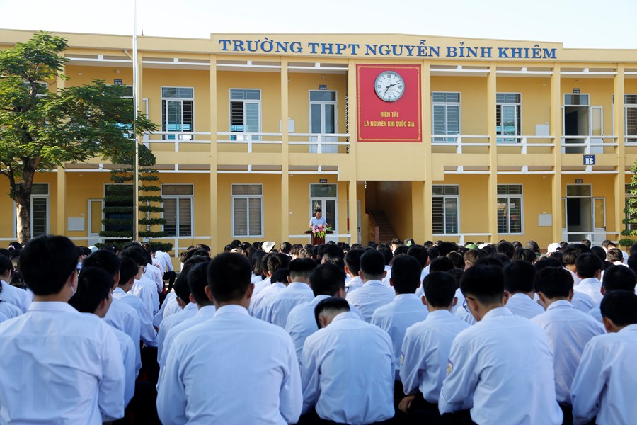 Thực hiện chỉ đạo về việc tổ chức lễ chào cờ tại các khối cơ quan, trường học, sáng ngày 02/10/2023 trường THPT Nguyễn Bỉnh Khiêm long trọng tổ chức lễ chào cờ tháng 10. Đây không chỉ là buổi lễ chào cờ đầu tháng mà còn là lễ chào cờ đầu tiên của năm học mới.