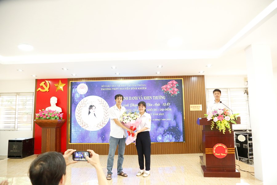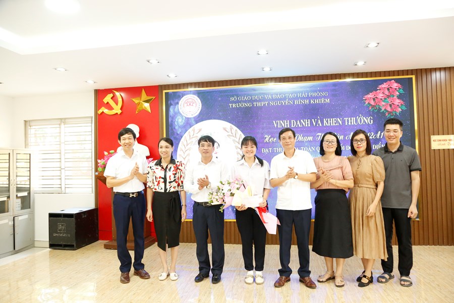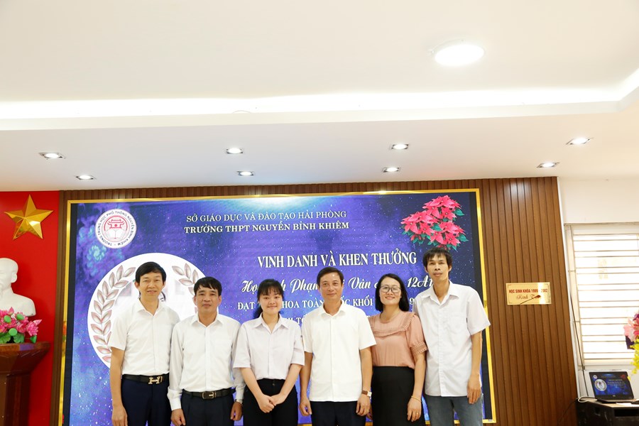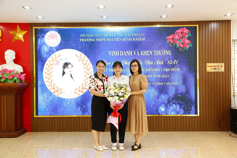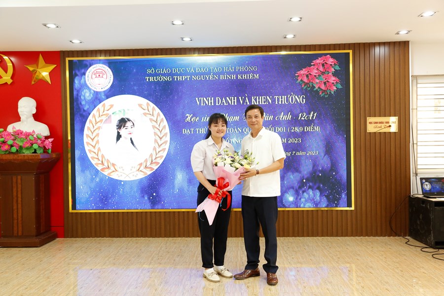 Chiều ngày 19/7/2023 trường THPT Nguyễn Bỉnh Khiêm long trọng tổ chức Vinh danh và khen thưởng đối với thủ khoa khối D01 Phạm Thị Vân Anh. Về dự có thầy Tống Công Thương - Bí thư đảng bộ, hiệu trưởng nhà trường, thầy Hoàng Minh Toàn - nguyên Bí thư đảng bộ, hiệu trưởng nhà trường, BCH Đảng ủy; BGH; Chủ tịch Công đoàn; Bí thư Đoàn thanh niên; Tổ trưởng; Phó Tổ trưởng; giáo viên chủ nhiệm lớp 12A1; giáo viên dạy ôn thi Tốt nghiệp THPT lớp 12A1; Thường trực Ban Đại diện cha mẹ