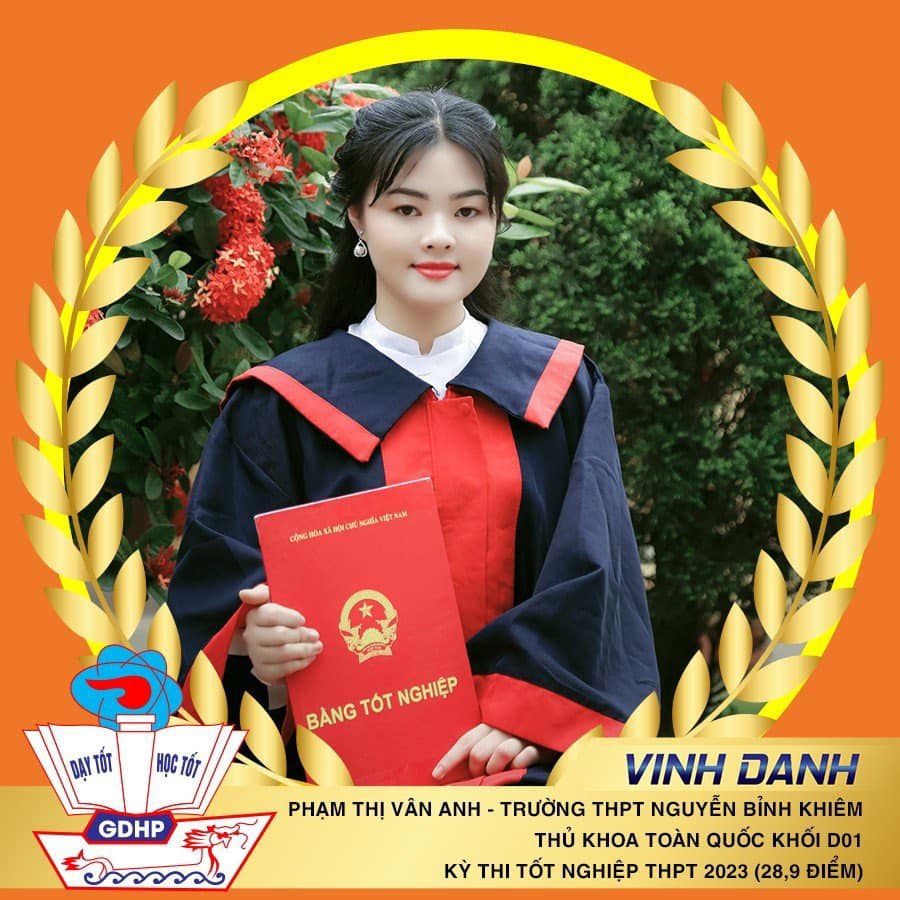P/S: Trong Kỳ thi tốt nghiệp THPT năm 2023 vừa qua, học sinh Phạm Thị Vân Anh xuất sắc đạt 28,9 điểm, với 9,5 điểm bài thi Ngữ văn; 9,6 điểm bài thi Toán; bài thi KHTN là 8,67, với điểm các môn tương ứng là Vật Lý: 9,5, Hoá học: 7,75, Sinh học: 8,75; bài thi Ngoại ngữ là 9,8 điểm.